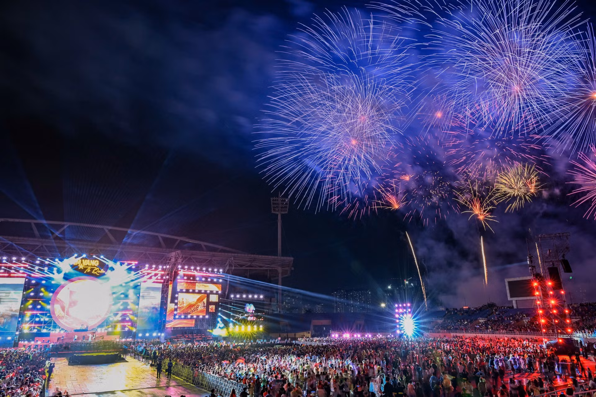 Xen kẽ giữa các nội dung trong chương trình là những màn pháo hoa rực rỡ trên nền trời Sân vận động Mỹ Đình. Buổi tối, trời mưa nặng hạt cũng không thể làm giảm nhiệt huyết và sự hào hứng của hơn 40 nghìn khán giả tại đây.